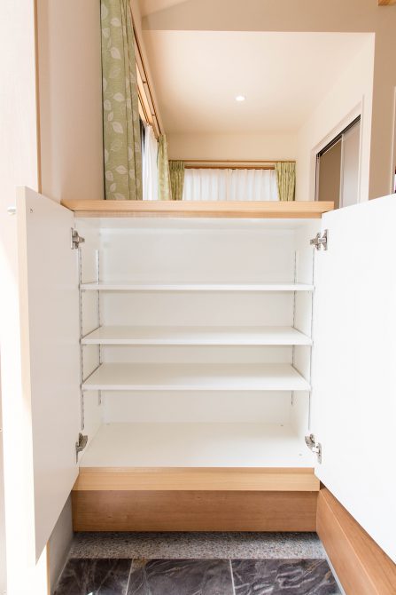 奥様お一人住まいの新築時の家具工事です。 TVカウンターの収納は、ルーバー建具を採用。 中に衣類を収納するため、通気機能を持たせました。 女性ならではの、鏡台。何をどのように収納するかを考えた結果、 このような形になりました。 下駄箱、キッチン収納も必要以上に大きくせずに、日常使い+αで80%の収納を目指したサイズになってます。