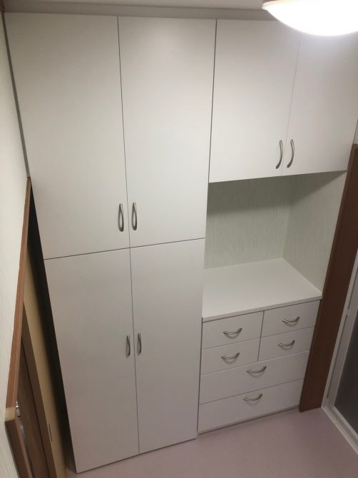 洗面脱衣室の家具の製作のご依頼をいただきました。 清潔感溢れる真っ白の家具です。 浴室側には着替えを置いておけるようにカウンターを設置しました。 引き出し収納を大小6杯。 入口側には掃除機が収納出来るミドルサイズの収納になっています。
