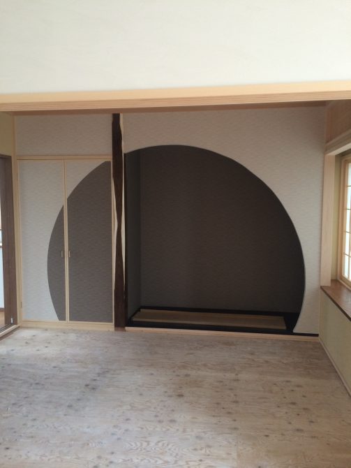和室の空間をご提案です。 円形をテーマとした和室で、床の間の垂れ壁のカーブから襖の押入にかけてカーブを伸ばし、クロス紙を貼り分ける事で、表現しました。 加えて書院風のサッシ内障子も、建具を閉めたときに、円形が浮かび上がるようデザインしました。 家全体もそうですが、各部屋で1つのテーマを決めてデザインを立案していくと、統一性のある部屋になり、 空間として美しい部屋になります。バランスが大切です。